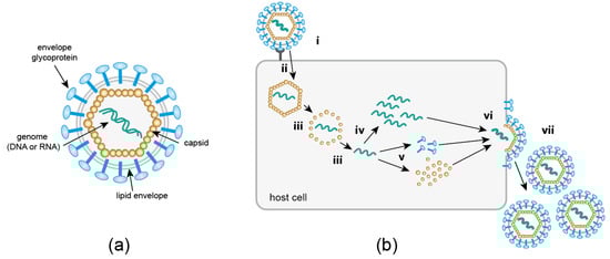 (a) Basic components of a virus particle. Non-enveloped viruses consist of nucleic acid encased in a proteinaceous capsid. Enveloped viruses are further surrounded by a lipid envelope derived from a host cell membrane, studded with viral glycoproteins required for cell attachment and entry. (b) Generic replication cycle of eukaryotic viruses. Details of individual steps vary greatly between different virus families. Receptor mediated attachment (i) is followed by cytosolic entry (ii), which may occur via an endocytotic process or—for enveloped viruses—membrane fusion. An uncoating step (iii) releases the viral genome, which is replicated (iv) either in the cytosol or in the nucleus of the host cell. Viral proteins are produced by the host cell translation machinery (v). Finally, newly synthesized virion components assemble into progeny particles (vi); this may occur either within the cell or directly underneath the plasma membrane. Release (vii) of progeny virus occurs via cell lysis, exocytosis or budding at the cell membrane.