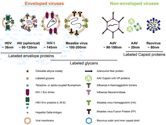 - Zhao, X.; Cai, L.; Adogla, E.A.; Guan, H.; Lin, Y.; Wang, Q. Labeling of Enveloped Virus via Metabolic Incorporation of Azido Sugars. Bioconjug. Chem. 2015, 26, 1868–1872. [Google Scholar] [CrossRef] [PubMed]