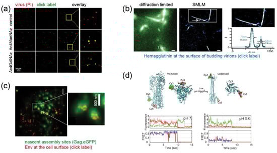 Examples for fluorescence labeling of viral proteins using click chemistry. (a) Metabolically labeled MV particles. The indicated sugars were added to the growth medium, virions were prepared and subjected to click labeling (green); propidium iodine staining (red) was performed to visualize all virions [29]. (b) Pulse-labeling of IAV HA exposed at the surface of budding virions using Cy3 and Cy5. The figure shows images of filamentous virus-like particles budding from the plasma membrane of a producer cell. Co-localization of both dyes at the nanoscale indicates incorporation of HA molecules synthesized at different times into the same particle [31]. (c) STED nanoscopy of click labeled HIV-1 Env in virus expressing cells shows clusters of Env molecules (red) recruited to viral assembly sites (visualized in diffraction limited mode via the structural protein Gag.eGFP; green) at the plasma membrane [32]. (d) Dual labeling of IAV HA at two different sites and smFRET reveal distinct conformational states of the molecule. Top, model of the modified protein in pre- and post-fusion conformation; bottom, smFRET traces recorded at pH conditions favoring the pre- (pH 7) and post-fusion (pH 5.6) state, respectively [33]. Images were modified from the indicated references, with permission.