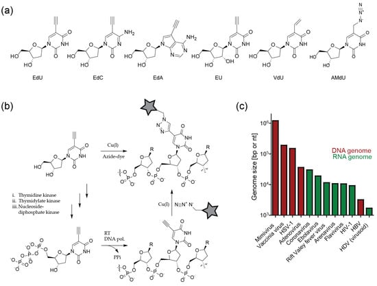 Labeling of viral nucleic acids by metabolic incorporation of unnatural nucleosides and click labeling. (a) Unnatural (deoxy)ribonucleosides suitable for click labeling approaches. (b) Intracellular phosphorylation and incorporation of an unnatural nucleoside/nucleotide and ligation to a fluorophore via CuAAC. (c) Sizes of exemplary viral genomes.