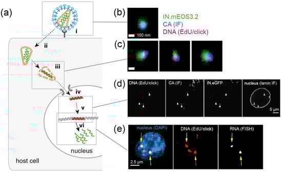 - Stultz, R.D.; Cenker, J.J.; McDonald, D. Imaging HIV-1 Genomic DNA from Entry through Productive Infection. J. Virol. 2017, 91, e00034-17. [Google Scholar] [CrossRef]