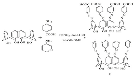 p-tert-butylcalix[4]arene was synthesized according to the method described in literature [30]. Calix[4]arene was prepared by the debutylation of p-tertbutylcalix[4]arene [31]. The azocalix[4]arene derivatives (1 and 2) were synthesized via a diazo coupling reaction between calix[4]arene and diazonium salts [32,33,34].