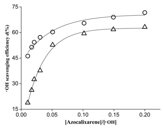 Hydroxyl radical scavenging efficiency as a function of the concentration ratio of [azocalixarene]/[·OH] where cycle (○) and triangle (△) represent azocalix[4]arene derivatives 1 and 2, respectively.