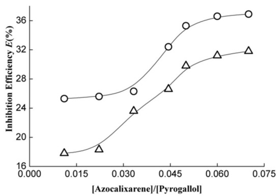Pyrogallol autoxidation inhibition efficiency as a function of the concentration ratio of [azocalixarene]/[pyrogallol] where cycle (○) and triangle (△) represent azocalix[4]arene derivatives 1 and 2, respectively.