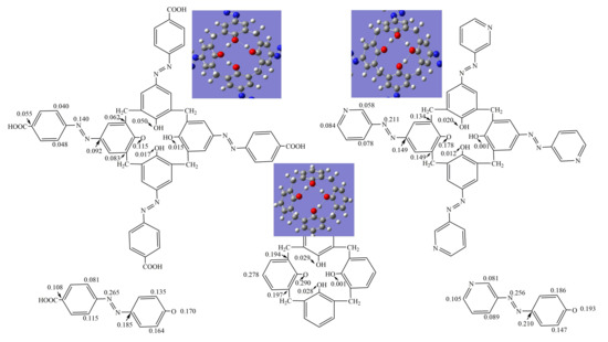 The stability of the phenoxyl radical produced via the HAT or SPLET process is another important index for antioxidants. It is desirable that a phenoxyl radical is produced with enough stability because otherwise it may not be able to easily induce a new chain reaction between itself and substrates. The unpaired electron distribution in phenoxyl radical plays an important role in determining its stability. More delocalized unpaired electrons in the radical creates more stability in the radical. In this present study, a spin density distribution analysis was performed and displayed in Figure 6 to explore the unpaired electron delocalization in the phenoxyl radical of azocalix[4]arene derivatives. Furthermore, the phenoxyl radicals of calix[4]arene, p-carboxyphenyl-azo-phenol and 3-aminopyridine-azo-phenol were also investigated and compared.