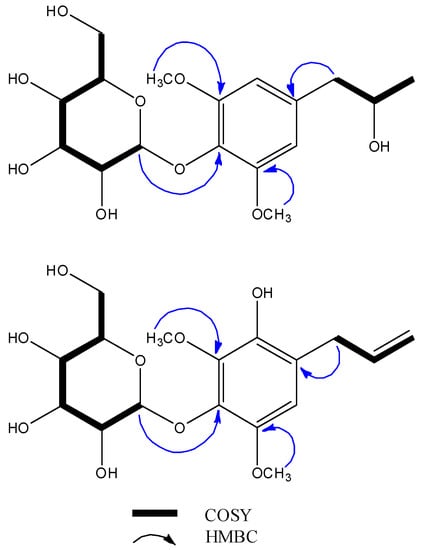 Compound 1 was isolated as a colourless gum. Its molecular formula was established as C17H26O9 using HR-ESI-MS. The 1H-NMR spectrum of 1 (Table 1) exhibited a singlet assignable to a symmetrical 1,3,4,5-tetrasubstituted aromatic ring at δH 6.56 (H-2/H-6), two methoxy signals at δH 3.84 (s, 3-OCH3 and 5-OCH3), and a signal attributable to the anomeric proton of the glucosyl moiety at δH 4.80 (dd, J = 7.6, 1.0 Hz, H-1′) was consistent with the β-configuration of the glucose. Meanwhile, the 13C-NMR spectrum exhibited six aromatic carbons at δC 108.3 (C-2/C-6), 137.5 (C-1), 154.0 (C-3/C-5), and δC 134.7 (C-4) and signals attributable to the glucosyl moiety at δC 62.4 (C-6′), 71.2 (C-4′), 75.7 (C-2′), 77.8 (C-3′), 78.3 (C-5′), and 105.5 (C-1′). The presence of a 2-propanol moiety that gave rise to signals at δC 46.7 (C-7), 69.7 (C-8), and 23.1 (C-9) was elucidated with the help of 1H–1H correlation spectroscopy (COSY) and heteronuclear multiple quantum correlation (HMQC) spectrum. Further, the corresponding heteronuclear multiple bond correlation (HMBC) spectrum confirmed the planar structure through the following correlation peaks: H-1′ (δH 4.80)/C-4 (δC 134.7), H-7 (δH 2.64 and 2.70)/C-1 (δC 137.5), C-2/6 (δC 108.3), and the two methoxy groups H-3/5-OCH3 (δH 3.84)/C-3/5 (δC 108.3). (Figure 2 and Supplementary Materials) The absolute configuration of 1 was determined through optical rotation and rotating frame nuclear overhauser effect spectroscopy (ROESY) spectrum. Thus, the ROESY spectrum suggested a correlation between H-7a (δH 2.70) and H-8 (δH 3.96) that, along with a large coupling constant between both protons of 7.0 Hz, permitted the establishment of the β-orientation of H-8. Moreover, the optical rotation of 1 was found to be −64.8. By comparing with the reported optical rotation values for (R)-3-phenylpropan-2-ol and (S)-1-phenylpropan-2-ol, which were −24.3 and +50.8, respectively [20,21], the configuration of C-8 was determined to be R. Therefore, compound 1 was established to be (8R)-8-(4-hydroxy-3,5-dimethoxy) propan-8-ol-4-O-β-d-glucopyranoside and named pipercroside A.