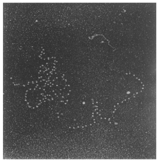 - Hall, C.E. Method for the observation of macromolecules with the electron microscope illustrated with micrographs of DNA. J. Biophys. Biochem. Cytol. 1956, 2, 625–628. [Google Scholar] [CrossRef]