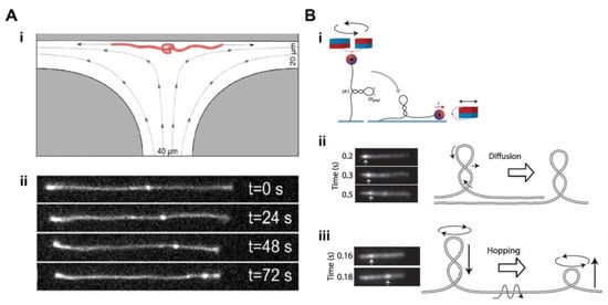 Fluorescence visualisation of topological intermediates of DNA. (A) Motion of knots in DNA: (i) A microfluidic T-junction flow cell with a diverging electric field stretches knotted linear DNA molecules at its stagnation point. (ii) Representative images of a single DNA molecule at four time points as a DNA knot (bright fluorescent spot) translates towards one end of the DNA molecule (reproduced with permission from [56]). (B) Dynamics of DNA supercoils: (i) Visualisation of plectonemes by fluorescence microscopy combined with magnetic tweezers. Individual DNA molecules are supercoiled by rotating a pair of magnets and subsequently pulled sideways by another magnet. (ii) Fluorescence images of plectoneme diffusion along an individual supercoiled DNA molecule stained with SxO. (iii) Fluorescence images of a plectoneme hopping along an individual supercoiled DNA molecule stained with SxO (reproduced with permission from [66]).