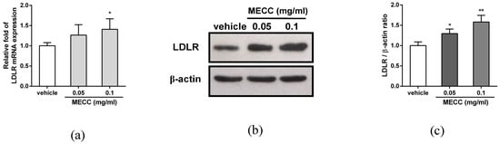 Effects of MECC on the LDLR expression in HepG2 cells. HepG2 cells were cultured in LPDS medium and treated with vehicle (0.1% DMSO) or MECC (0.05 and 0.1 mg/mL) for 24 h. (a) The level of LDLR mRNA was measured by reverse transcription real-time PCR analysis. (b) The levels of LDLR and β-actin proteins were analyzed by Western blot analysis. The experiments were replicated three times, and a representative blot was shown. (c) The intensity of LDLR normalized to the β-actin protein is presented as the means ± SD of three independent experiments. * p < 0.05 and ** p < 0.01 represent significant differences compared to the vehicle-treated group.