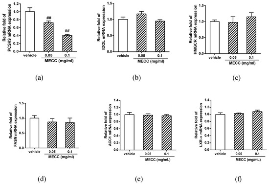We further investigated whether MECC altered the mRNA expression of selected genes for cholesterol homeostasis and lipogenesis by reverse transcription real-time PCR analysis. First, we analyzed the genes involved in the LDLR modulation and cholesterol homeostasis in hepatic cells including PCSK9 [30], inducible degrader of LDLR (IDOL) [31] and HMG-CoA reductase (HMGCR). As shown in Figure 4a, MECC (0.05 and 0.1 mg/mL) markedly decreased the level of PCSK9 mRNA by approximately to 0.78- and 0.46-fold as compared with the vehicle-treated group (p < 0.01), respectively. However, the MECC-treated cells did not exhibit changes in the mRNA expression of IDOL and HMGCR (Figure 4b,c). Next, the effect of MECC on the genes involved in lipogenesis was also evaluated. The mRNA expression of fatty acid synthase (FASN) was slightly but not significantly decreased in the MECC-treated cells (Figure 4d). The expression levels of acetyl-CoA carboxylase (ACC1) and liver X receptor-α (LXRα) were not altered in the MECC-treated cells (Figure 4e,f).