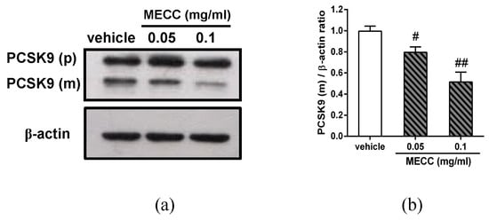 Effects of MECC on PCSK9 protein expression in HepG2 cells. Cells were cultured in LPDS medium and treated with vehicle (0.1% DMSO) or MECC (0.05 and 0.1 mg/mL) for 24 h. (a) The PCSK9 proprotein form (p), mature form (m) and β-actin proteins were determined by Western blot analysis. The experiments were at least replicated three times, and a representative blot was shown. (b) The intensity of the PCSK9 mature form protein (PCSK9 (m)) normalized to the β-actin is presented as the means ± SD of three independent experiments. # p < 0.05 and ## p < 0.01 represent significant differences compared to the vehicle-treated group.