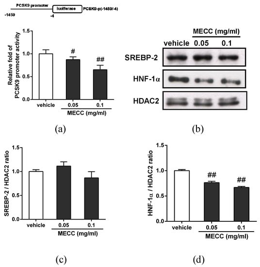 Effects of MECC on the PCSK9 promoter activity and transcriptional activators in HepG2 cells. (a) HepG2 cells were transfected with PCSK9 promoter-luciferase reporter plasmid (PCSK9-p(-1459/-4)) and Renilla control plasmid for 24 h, and treated with vehicle or MECC (0.05 and 0.1 mg/mL) for an additional 24 h. The luciferase activity was measured and normalized to the respective Renilla luciferase activity. The data are presented as the means ± SD from three independent experiments. (b) The nuclear SREBP-2, HNF-1α and HDAC2 proteins were determined by Western blot analysis. The experiments were at least replicated three times, and a representative blot was shown. The normalized intensities of SREBP-2 (c) and HNF-1α (d) versus HDAC2 are presented as the means ± SD of three independent experiments. # p < 0.05 and ## p < 0.01 represent significant differences compared to the vehicle-treated group.