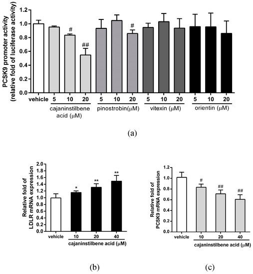 Furthermore, we examined the effect of cajaninstilbene acid, pinostrobin, vitexin, and orientin on the transcriptional activity of PCSK9 promoter in the PCSK9 promoter/luciferase reporter stable cell line. The activity of PCSK9 promoter was significantly inhibited by the cajaninstilbene acid (10 and 20 μM) and slightly reduced by pinostrobin (20 μM), however, was not altered by vitexin and orientin in hepatic cells (Figure 7a). We further determined whether cajaninstilbene acid is involved in the modulation of LDLR and PCSK9 gene expression. As shown in Figure 7b,c, cajaninstilbene acid (10–40 μM) significantly increased the LDLR mRNA expression, and reduced the PCSK9 expression in HepG2 cells. These results indicate that the cajaninstilbene acid may play a critical role on the MECC-mediated modulation of LDLR and PCSK9 expression.