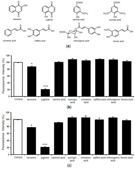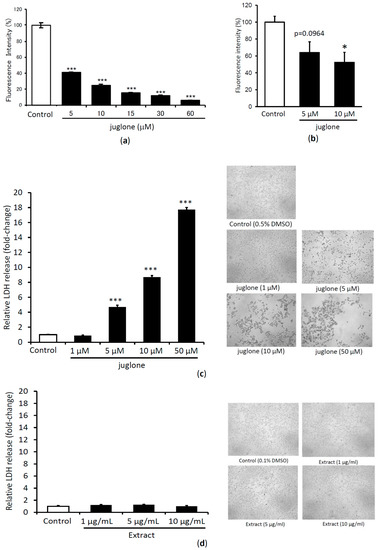 - Inbaraj, J.J.; Chignell, C.F. Cytotoxic Action of Juglone and Plumbagin: A Mechanistic Study Using HaCaT Keratinocytes. Chem. Res. Toxicol. 2004, 17, 55–62. [Google Scholar] [CrossRef] [PubMed]