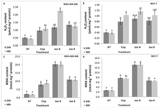 H2O2 content (A and B) and MDA content (C and D) in the MDA-MB-468 (A and C) and MCF-7 (B and D) cell lines after treatment with methanolic extracts of Joo needles (Joo N) and Joo berries (Joo B). Each value represents the mean of six replicates. Bars represent the standard error. Different letters indicate significant differences among treatments at p = 0.05.