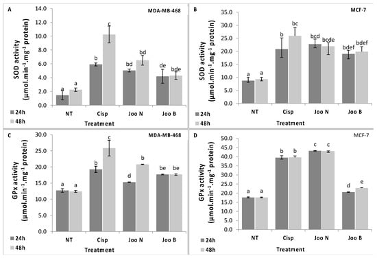 Activities of antioxidative enzymes; superoxide dismutase (SOD, A and B) and glutathione peroxidase (GPx, C and D) in the MDA-MB-468 (A and C) and MCF-7 (B and D) cell lines after treatment with methanolic extracts of Joo needles (Joo N) and Joo berries (Joo B). Each value represents the mean of six replicates. Bars represent the standard error. Different letters indicate significant differences among treatments at p = 0.05.