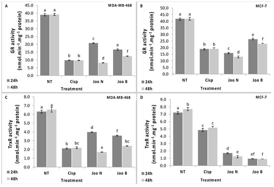 Activities of glutathione reductase (GR, A and B) and thioredoxin reductase (TrxR, C and D) in the MDA-MB-468 (A and C) and MCF-7 (B and D) cell lines after treatment with methanolic extracts of Joo needles (Joo N) and Joo berries (Joo B). Each value represents the mean of six replicates. Bars represent the standard error. Different letters indicate significant differences among treatments at p = 0.05.