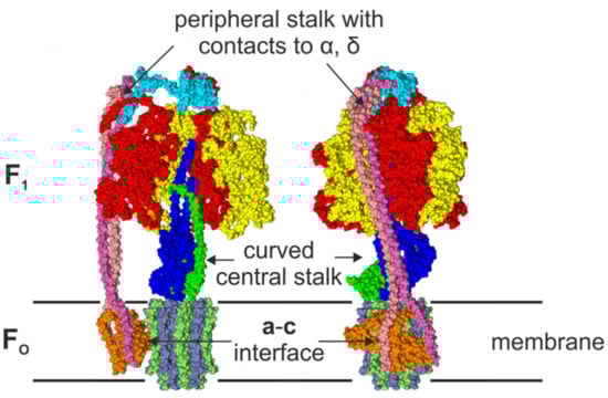 The FO and F1 domains are also connected by a peripheral, eccentric stalk. In eubacteria, this stalk is composed of a homodimer of b subunits that forms a right-handed coiled-coil [,,], which is tethered to the δ subunits, and docks to subunit a that serves as the interface with the c10-ring. Subunit δ binds to the N-termini of all α subunits at the top of the F1-head. This rigid stator stalk [,,] is the most obviously asymmetric feature in F-ATP synthases.