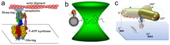 - Adachi, K.; Oiwa, K.; Nishizaka, T.; Furuike, S.; Noji, H.; Itoh, H.; Yoshida, M.; Kinosita, K., Jr. Coupling of rotation and catalysis in F1-ATPase revealed by single-molecule imaging and manipulation. Cell 2007, 130, 309–321. [Google Scholar] [CrossRef]
