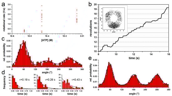 - Shimabukuro, K.; Yasuda, R.; Muneyuki, E.; Hara, K.Y.; Kinosita, K., Jr.; Yoshida, M. Catalysis and rotation of F1 motor: Cleavage of ATP at the catalytic site occurs in 1 ms before 40° substep rotation. Proc. Natl. Acad. Sci. USA 2003, 100, 14731–14736. [Google Scholar] [CrossRef]