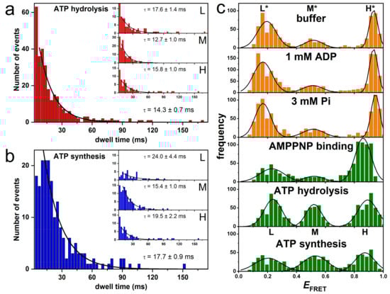 In another set of single-molecule fluorescence measurements, smFRET was applied to investigate subunit rotation in liposome-reconstituted EcFOF1 during ATP hydrolysis and ATP synthesis [,,,,,,,,]. To monitor the rotary motion of subunit ε during catalysis, the FRET donor fluorophore tetramethylrhodamine–C5–maleimide was bound to a cysteine in subunit ε (εH56C) and the FRET acceptor fluorophore Cy5bis–C5–maleimide was coupled to crosslink the two b subunits of the peripheral stalk (bQ64C). Single molecules of EcFOF1 were observed in freely diffusing liposomes using a confocal microscope setup (Figure 2b). The rotation of the rotor subunit ε relative to the static b2 homodimer was recorded for ATP-driven ATP hydrolysis at saturating ATP concentrations (1 mM) and for proton-driven ATP synthesis at a high proton motive force, i.e., comprising an initial proton concentration difference of 4.1 pH units and an electric membrane potential. Excitation of the donor fluorophore resulted in photon bursts with different donor and acceptor intensities. The observation time of the freely diffusing proteoliposomes was limited to a few hundred milliseconds, and one, two, or three FRET efficiency levels could be discriminated in each photon burst. As before, these FRET levels corresponded to the catalytic dwells in between power strokes. The length of each dwell for the three distinct FRET levels was plotted in a histogram in order to calculate the mean dwell time for each FRET level separately. For the kinetic analysis, the first and last FRET level of a photon burst were omitted, as their actual duration before entering and after leaving the confocal detection volume remained unknown. For both ATP hydrolysis and ATP synthesis, three FRET levels were observed representing the three distances between the FRET labels or the relative orientation of the subunits, respectively, during the 120° rotation in EcFOF1. Average dwell times for the three orientations were 12.7 ± 1.0 ms (medium FRET efficiency, M-level), 17.6 ± 1.4 ms (low FRET efficiency, L-level), and 15.8 ± 1.7 ms (high FRET efficiency, H-level) during ATP hydrolysis (Figure 4a), and 15.4 ± 1.0 ms (M-level), 24.0 ± 4.4 ms (L-level), and 19.5 ± 2.2 ms (H-level) for ATP synthesis (Figure 4b). In both cases, kinetic analysis yielded an asymmetric distribution of FRET level dwells. The M-level had a significantly shorter dwell time than the l- and H-level, and the short and long dwell times differed by factors of 1.39 and 1.56 for ATP hydrolysis and synthesis, respectively [].