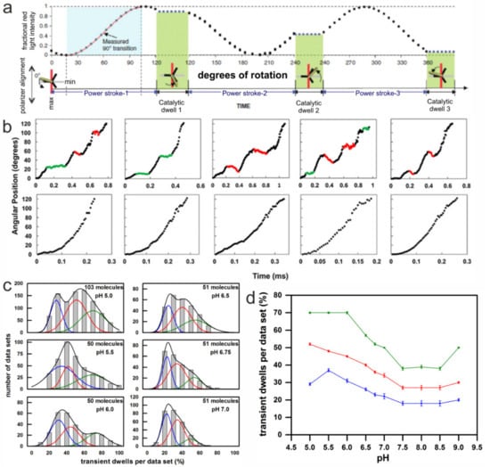 In this assay, instead of an actin filament, an 80 × 40 nm AuNR was attached to the c-ring of EcFOF1 as a visible probe, and ATP hydrolysis driven rotation of EcFOF1 was measured. The ability to acquire data at speeds equivalent to 100 k frames per s in combination with an AuNR substantially improved the time resolution to 10 µs, and increased the accuracy of determining rotational position to a standard error of 0.02°–0.12° []. When passed through a polarizing filter and measured by an avalanche photo diode, the polarized red light scattered from an AuNR of these dimensions changed in a sinusoidal manner as a function of the rotary position of the AuNR versus the polarizer direction. For each dataset, the polarizer was aligned with each AuNR-EcFOF1 complex to minimize the scattered red light intensity during one of the three catalytic dwells. The light intensity data collected from the subsequent 120° power stroke resulted in an increase from a minimum through a maximum, at which point the AuNR has rotated 90° []. These power strokes were selected for further analysis from the total of three successive power strokes that are required to complete 360° of rotation (Figure 5a).