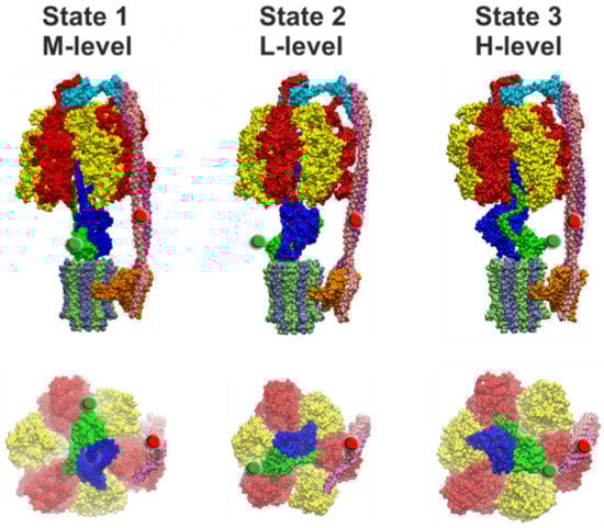 Side view (top row) and view from the membrane side with the c-ring and subunit a omitted of the three cryo-EM structural states of EcFOF1 []. State 1 (PDB-id: 5T4O, left), state 2 (PDB-id: 5T4P, middle), and state 3 (PDB-id: 5T4Q, right) correspond to FRET levels M, L, and H, respectively (as in Figure 4). In each image, the FRET-donor position at ε56 is marked with a green sphere and the FRET-acceptor position at b64 is marked with a red sphere. The portions of subunit ε and γ that extends beyond the diameter of the c-ring must pass through the narrow gap created by the peripheral stalk during rotation from state 3 to state 1, and during rotation from state 1 to state 2, respectively. The subunit coloring is the same as in Figure 1.