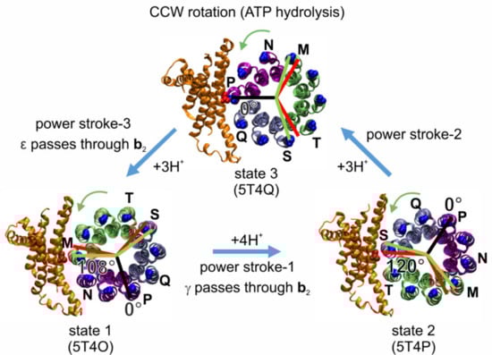 - Martin, J.L.; Ishmukhametov, R.; Hornung, T.; Ahmad, Z.; Frasch, W.D. Anatomy of F1-ATPase powered rotation. Proc. Natl. Acad. Sci. USA 2014, 111, 3715–3720. [Google Scholar] [CrossRef] [PubMed]