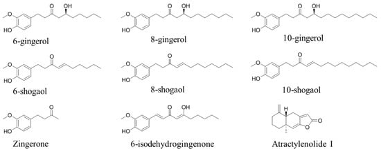Ginger, the rhizome of Zingiber officinale Rosc. (Z. officinale), is frequently utilized as both a spice and a traditional herbal medicine for centuries all over the world due to its health benefits [1,2,3]. Several regulatory authorities identify ginger as a safe supplemental herbal [4,5], and it is also implemented in complementary and alternative medicine preparations for the treatment of different diseases, such as headaches, colds, and fevers, for reliving gingivitis, and as an anti-emetic, expectorant, and appetite stimulant [6,7,8]. Furthermore, previous studies have revealed that ginger possesses anti-tumor activity [9,10].