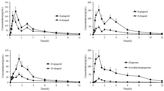 Mean plasma concentration–time curves of eight analytes after oral administration of ginger extract at a dose of 400 mg/kg. (n = 10, mean ± SD).
