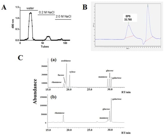 Isolation, molecular mass determination and monosaccharide composition of EPS from S. thermophilus MN-BM-A01. (A) Crude EPS separation profile by anion-exchange chromatography of DEAE Sepharose Fast flow. (B) GPC chromatogram of EPS-1. (C) Chromatogram of standard monosaccharides (a) and EPS-1 from S. thermophilus MN-BM-A01 monosaccharides (b) on chromatographic column.