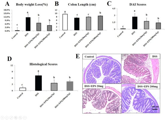 EPS-1 attenuates DSS-induced acute murine colitis. (A) Body weights loss, (B) variations of colon length, (C) disease activity index (DAI), and (D) histological scores of mice from each treatment group. (E) Representative HE staining colonic tissue from each treatment group, scale bars, 200 μm. Values with different superscript letters (a, b, c, d) are significantly different (p < 0.05).