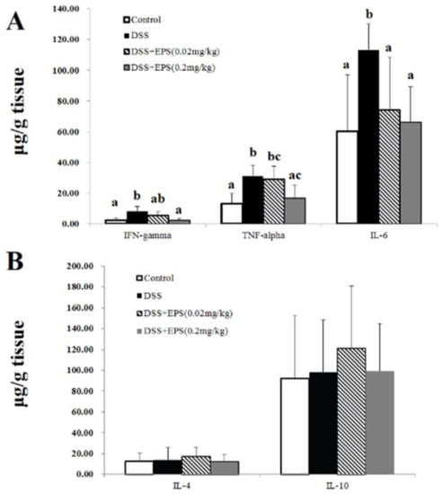 EPS-1 promoted a change in pro-inflammatory and anti-inflammatory cytokines. (A) The levels of pro-inflammatory cytokines in the colonic tissues from each treatment group. (B) The levels of anti-inflammatory cytokines in the colonic tissues from each treatment group. Values with different superscript letters (a, b, c) are significantly different (p < 0.05).