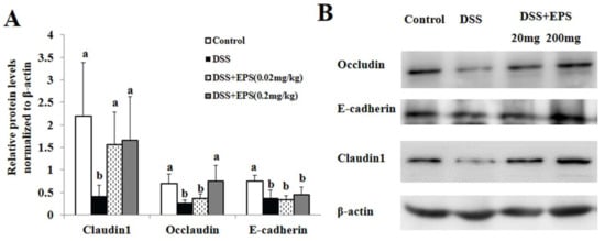 Colon tissues and Caco-2 cells were homogenated and lysed in lysis buffer supplemented with the protease and phosphatase inhibitor (PMSF, 0.5 mmol/L). Briefly, 100 mg tissue was homogenized in Radio Immunoprecipitation Assay (RIPA) lysis buffer (Beyotime) by using homogenizer. After homogenization, the supernatant was collected after a 5 min centrifugation at 17,346× g, 4 °C. 4 × 105 Caco-2 cells were seeded in 6-Well Plate for 24 h. Then treated with LPS (10 μg/mL) without or with EPS-1 (2 mg/mL) incubation for another 24 h. The cells were then lysed and extracted protein with RIPA buffer by ultrasonication. Collected the supernatant by 12,744× g centrifugation, 4 °C, 10 min. The protein concentration was determined using BCA protein assay reagent kit (Beyotime), then the concentration of each sample was unified and the lysates were mixed with 4× sodium dodecyl sulfonate (SDS) sample loading buffer and denatured in boiling water for 5 min to denature the protein and then separated by 10~15 g/100 mL SDS-PAGE. Then the proteins were electro-transferred to PVDF member at 200 mA for 2 h. The membranes were incubated with primary antibodies: anti-β-actin (1:2500, Bioss, Beijing, China), Anti-Occludin (1:50,000, Abcam, Cambridge, MA, USA), anti-E-cadherin (1:1000, Abcam, USA), anti-Claudin1 (1:2000, Abcam, USA) for 12 h at 4 °C. After 5 times washed with 0.1 g/100 mL Tween-20 in PBS, then incubated with secondary antibodies (anti-rabbit and anti-mouse, 1:1000, Beyotime, Shanghai, China) for 1 h at room temperature. After being washed five times, the protein bands were visualized by ECL substrate (Millipore, Bedford, MA, USA) and Amersham Imager 600 (GE Healthcare, Boston, MA, USA). The density of the protein bands were quantified using Gel-pro software 4.0 (Media Cybernetics, Rockville, MD, USA) and β-actin was used as a control protein.