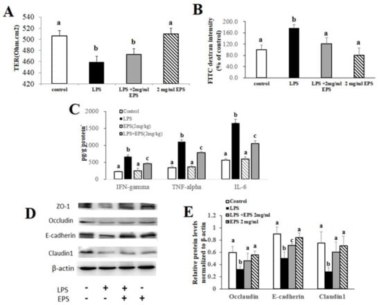 EPS-1 Protected intestinal barrier integrity from the disruption by LPS in Caco-2 monolayer. (A) The changes of transepithelial electrical resistance (TER) before and after treatment with LPS (10 μg/mL) and/or EPS-1 (2 mg/mL) for 24 h in Caco-2 monolayer. (B) FITC-dextran (4 kDa) permeability measurement in 21-day cultured Caco-2 monolayer after LPS and/or EPS-1 treatment. (C) The levels of pro-inflammatory cytokines in the Caco-2 cells from each treatment group. (D) Protein expression of Occludin, E-cadherin and Claudin1 in the Caco-2 cells from each treatment group. (E) Relative protein levels of Occludin, E-cadherin and Claudin1 in Caco-2 cells normalized to β-actin. Values with different superscript letters (a, b, c) are significantly different (p < 0.05).