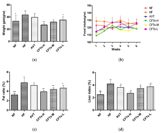 As shown in Figure 1c, rats in the HF group with high-fat diets had a higher fat ratio than those in the NF group (p < 0.001); rats in the former group also showed a high percentage of white adipose tissue in HF groups. In addition, the treatments with CFTs at 1200, 600 and 300 mg/kg·d significantly decreased the body ration (p < 0.01, p < 0.01 and p < 0.05, respectively) compared with the HF group, while there was no significance in the AVT group. Liver indexes are shown in Figure 1d. Notably, our results showed that rats in the NF group with normal food diets exhibited a significant lowering effect on liver index compared to those of the HF group with high-fat diets (p < 0.05). The treatment experiments with CFTs and the AVT group markedly reduced the liver index compared to HF group, and CFTs treatment groups exhibited a dose-dependent effect on the liver indexes (CFTs-H: p < 0.01, AVT: p < 0.05). These results suggest that CFTs inhibit the accumulation of fat pad and reduce the fat body ratio in a dose-dependent manner; finally, the CFTs treatment groups showed slightly better results than the AVT group in reducing the fat body ratio.
