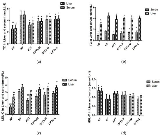 The effect of CFTs on lipid levels in the serum and liver. (a) TC levels in serum and liver; (b) TG levels in the serum and liver; (c) LDL-C levels in the serum and liver; (d) serum and liver HDL-C levels. These data are presented as the means ± SD (n = 10). (*,#) Significant difference at p < 0.05, (**,##) significance difference at p < 0.01 and (###) significance difference at p < 0.001 VS the HF group.