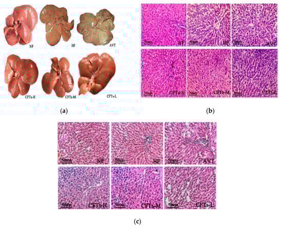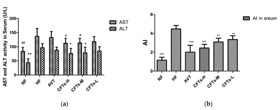 Liver damage and hepatotoxicity are the main symptoms of hyperlipidemia [18,19]. Additionally, the serum ALT and AST activities are thought to be the main toxicological parameters for liver function [20]. As shown in Figure 3, the serum AST and ALT activities of CFTs-H and CFTs-M group were significantly lower than those of the HF group (p < 0.05), proving that CFTs has no toxicity in the liver.