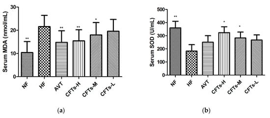 Malondialdehyde (MDA) is the ultimate product of lipid oxidation and can indirectly measure the extent of damage to the biofilm system. In Figure 4a, it can be seen that the serum MDA content of the experimental rats in the high-fat groups is higher than that of NF. In the NF group, experiments have shown that high-fat diets increase the body’s oxidative stress response. In addition, the serum MDA value in the CFTs-H, CFTs-M group was significantly lower than that in the HF group, indicating that CFTs can effectively inhibit the level of oxidative stress in rats.