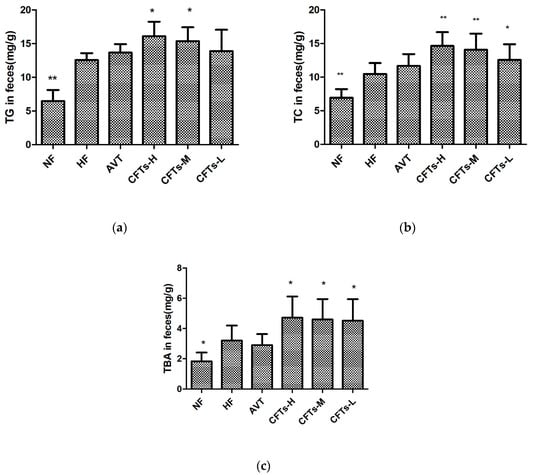 To determine the reduction of lipid absorption, we investigated TC, TG and TBA levels in rat feces. As shown in Figure 5 and Table 1, the fecal TC levels showed a significant increase in the CFTs group, especially rats of the CFTs-H and CFTs-M group (p < 0.01), compared with HF group. The fecal TG levels in the CFTs-H and CFTs-M group (p < 0.05) were significantly higher than those in the HF group, and the same as the fecal TBA levels in treatments with the CFTs group. To reduce fat absorption, excessive cholesterol was transported from peripheral tissue to the intestine, where it promoted excretion of bile acids. These results indicate that CFTs effectively ameliorates lipid metabolism by accelerating the excretion of cholesterol in the feces.