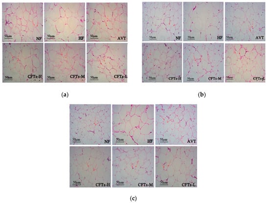 Figure 7 shows a histological examination of perirenal adipose tissues, and subcutaneous and epididymal adipose tissues in rats, respectively. The perirenal and subcutaneous fat cells of HF were significantly more hypertrophic than those of the NF group, and the treatment with CFTs groups showed a different degree of reduction in the size of adipocytes, suggesting that CFTs have an anti-hyperlipemia activity by reducing the accumulation of white adipose tissues.