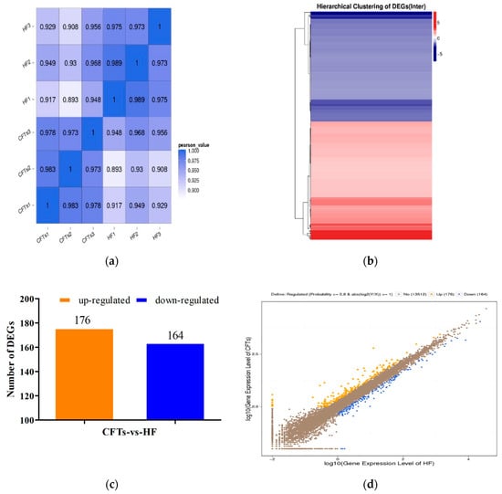 Differential gene expression analysis (HF vs CFTs). (a) Heatmap of correlation coefficient values; (b) Intersection heatmap of DEGs; (c) Statistic of differentially expressed genes; (d) Scatter plots of all expressed genes.