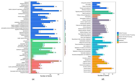 To understand the molecular mechanism of the anti-hyperlipidemic effects of CFTs, differential gene expression and GO enrichment analysis of liver in HF, CFTs group were conducted. As shown in Figure 8a–d, differential gene expressions were detected in the CFTs groups and the HF group. Figure 8a directly indicates good biological repeatability; Figure 8b–d shows that 176 and 164 genes were up-regulated and down-regulated, respectively. These results indicate that CFTs can regulate the expression of genes in hyperlipidemic rats.