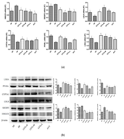 Based on the differential expression of lipid metabolism, several key differential genes were confirmed for the molecular function, including CYP7A1, LXRA and PPARα expression. As shown in Figure 10a, CYP7A1, LXRA and PPARα mRNA expression in the liver of CFTs-H groups was up-regulated compared to HF group (p ≤ 0.01), and the mRNA expression levels of the CFTs-L and CFTs-M groups were significantly up-regulated. The AVT group showed similar effects. The protein expression profiles of CYP7A1, LXRA and PPARα protein expression in the liver were the same as those of the mRNA profiles (Figure 10b), suggesting that CFTs promote hepatic cholesterol excretion by upregulating CYP7A1, LXRA and PPARα expression.