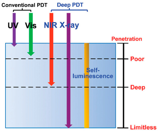- Mallidi, S.A.S.; Bulin, A.L.; Obaid, G.; Ichikawa, M.; Hasan, T. Beyond the Barriers of Light Penetration: Strategies, Perspectives and Possibilities for Photodynamic Therapy. Theranostics 2016, 6, 2458–2487. [Google Scholar] [CrossRef] [PubMed]
