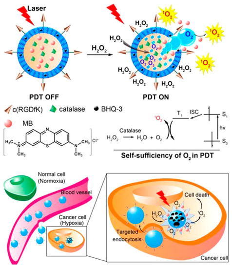 - Dang, J.; He, H.; Chen, D.; Yin, L. Manipulating tumor hypoxia toward enhanced photodynamic therapy (PDT). Biomater. Sci. 2017, 5, 1500–1511. [Google Scholar] [CrossRef] [PubMed]