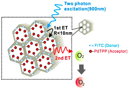 - Cheng, S.-H.; Hsieh, C.-C.; Chen, N.-T.; Chu, C.-H.; Huang, C.-M.; Chou, P.-T.; Tseng, F.-G.; Yang, C.-S.; Mou, C.-Y.; Lo, L.-W. Well-defined mesoporous nanostructure modulates three-dimensional interface energy transfer for two-photon activated photodynamic therapy. Nano. Today 2011, 6, 552–563. [Google Scholar] [CrossRef]