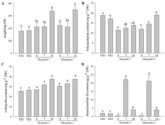 Effect of different time to start treatment (at the 0, 7th, and 16th day of subculture) on biomass (A), contents of polysaccharide (B), lobetyolin (C), and atractylenolide III (D) in the adventitious roots of C. pilosula treated with 50 and 100 µmol·L−1 methyl jasmonate (MeJA), respectively. The samples were collected at the 24th day of subculture and then analyzed. CK1, blank control; CK2, solvent control. Statistically significant differences between the means were determined using Fisher’s LSD test p < 0.05) and indicated with different lowercase letters.