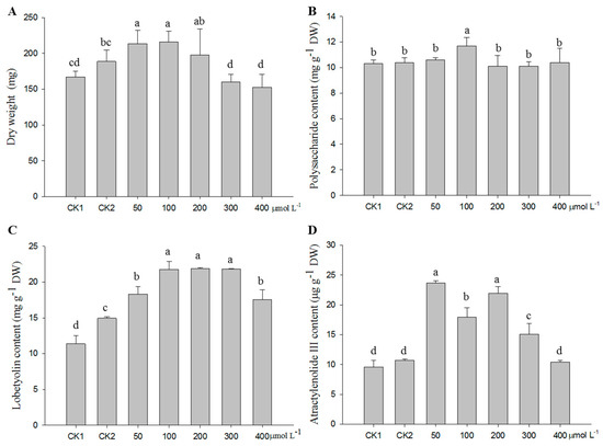According to the above results, the adventitious roots were treated with MeJA at the 16th day of subculture to analyze the effect of different MeJA concentrations. Results showed that the biomass of the adventitious roots significantly increased with the treatment of 100 µmol·L−1 MeJA compared to the controls, whereas a high MeJA concentration (300 and 400 µmol·L−1) had an inhibition effect on growth (Figure 2A). Upon the 100 µmol·L−1 MeJA treatment, the samples contained a significantly higher polysaccharide content than the controls and the other treatments (Figure 2B). Lobetyolin content in the treatments with 100 µmol·L−1 MeJA was significantly higher than the controls and the treatment with 50 µmol·L−1 MeJA, with no differences among the treatments with 100, 200, and 300 µmol·L−1 MeJA (Figure 2C). For atractylenolide III, all the treatments noticeably promoted its accumulation, excluding the treatment of 400 µmol·L−1 MeJA. Relatively, the treatments with 50 and 200 µmol·L−1 MeJA had the highest content of atractylenolide III in the adventitious roots (Figure 2D).