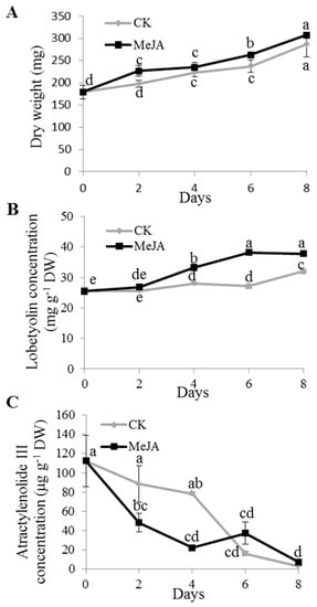 To observe the response time point of metabolite to MeJA, based on the above results, 100 µmol·L−1 MeJA was applied to analyze the dynamic of lobetyolin accumulation in the adventitious roots, while the application of 50 µmol·L−1 MeJA was performed to dynamically determine the atractylenolide III content. Additionally, the adventitious roots were treated with MeJA at the 16th day of subculture. The dynamics of polysaccharide accumulation were not included for the obscure change upon MeJA treatment in the above studies. The results showed that the biomass gradually increased with time, both in the control and in the treatment. Moreover, the dry weight of the treatment was moderately higher than the control (Figure 3A). The lobetyolin content sharply increased at the 4th day after the treatment in the adventitious roots, while lobetyolin in the control had significant increased at the 8th day after treatment, with no obvious differences within 6 days, but still being lower than that in the treatment (Figure 3B). Overall, the atractylenolide III content decreased during the treatment course, both in the control and the treatment (Figure 3C).